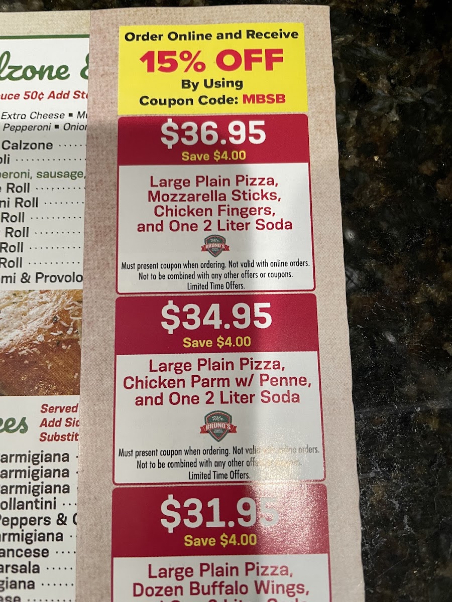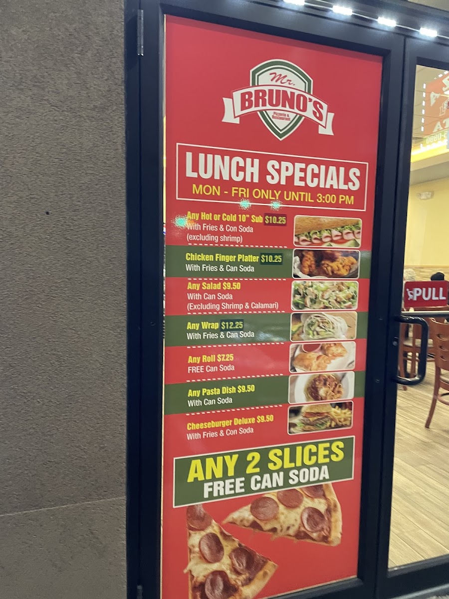 The salads are equally impressive, featuring fresh ingredients like in the Chef Salad for $14.34. Don't forget to save room for dessert—indulge in the classic Tiramisu or a rich Cannoli. Customers rave about the quality, flavor, and generous portions, solidifying Mr Bruno's as a top choice for pizza lovers and pasta aficionados alike. Come explore the menu; you're bound to fall in love with the offerings!